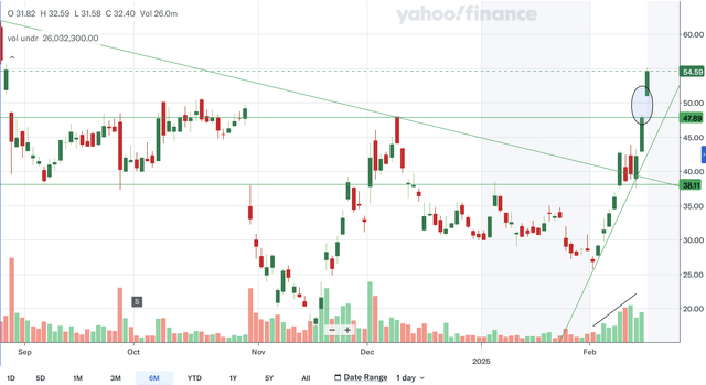 除了之前的下行趋势线和当前的上行趋势线外,还有两个重要的支撑位值得讨论。第一个支撑位在 48 左右。它代表当前交易日的上行缺口。该水平也是 12 月的关键阻力位,因此突破该区域将为未来提供强有力的支撑。另一个支撑区域在 38 左右,代表 9 月份的支撑位和 1 月初的阻力位。