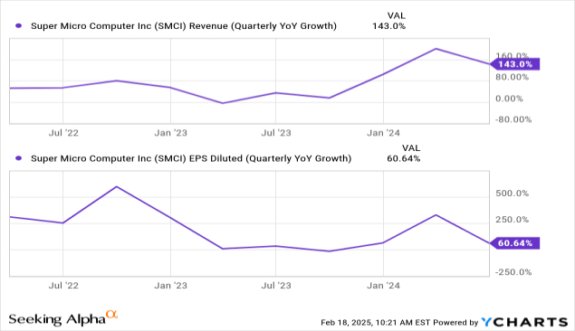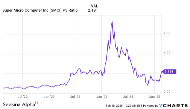目前,超微电子的市销率为 2.191。相对于 2024 年的峰值水平,这是一个相当低的水平,但与 2023 年下半年的水平相比,总体而言仍然不是特别低。该倍数最近随着股价飙升,总体而言,它反映了股票的公允估值。如上所述,目前收入增长率为 54%,第三季度的指引显示,它将放缓至 42.9% 左右的中点增长。如果你看看上面的增长图表,这个指引代表着与过去三年相比略低于平均水平的增长。