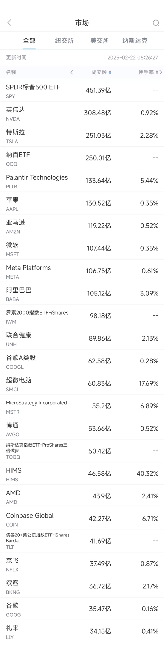第3名Palantir收跌4.63%,成交133.64亿美元。该股本周下跌约15%,导致其股价大幅下跌的原因包括其CEO减持、公司合同甲方美国国防部将大幅削减开支、目前该股的市盈率接近惊人的600倍等。