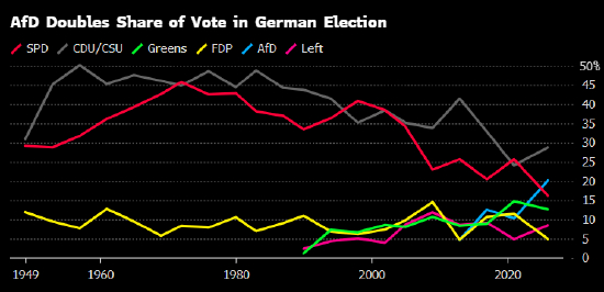 尽管如此,德国选择党仍有可能被排除在政权之外,因所有其他党派都排除了与其联合组阁的可能性,其中也包括在弗里德里希·默茨率领下赢得大选胜利的中右翼保守派联盟。选民对移民和物价飙升的愤怒推高了德国选择党的支持率,而这两者也是在全欧洲助长极右势力崛起的主因。