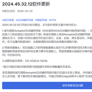 2月25日,特斯拉中国官方宣布,分批次为车主推送2024.45.32.12软件更新,包括城市道路Autopilot自动辅助驾驶、驾驶室摄像头和地图包版本更新CN-2025.8-15218。