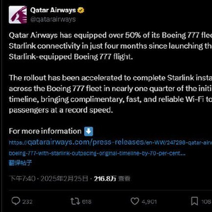 卡塔尔航空:已在30架飞机上安装星链Wi-Fi,预计第二季度完成全面部署