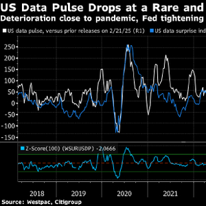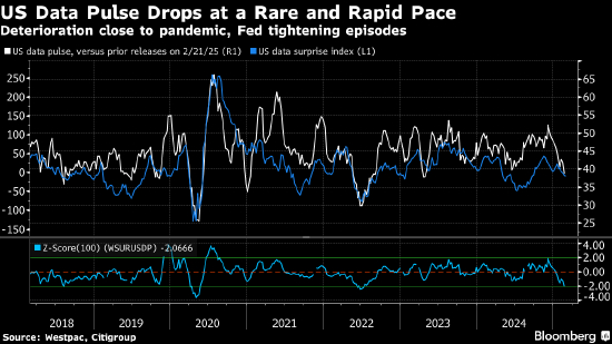 过去2-3个月经济数据变糟,扭转了2024年下半年初 —— 美联储终于要开启宽松周期时 —— 开始爆发的强劲势头。花旗集团拿数据与预测进行比较的意外指数,还有西太平洋银行拿数据与前值进行比较的指数,都显示始于美国大选后、今年还在延续的经济迅速恶化。