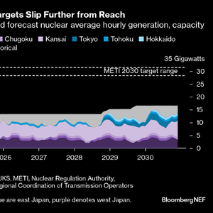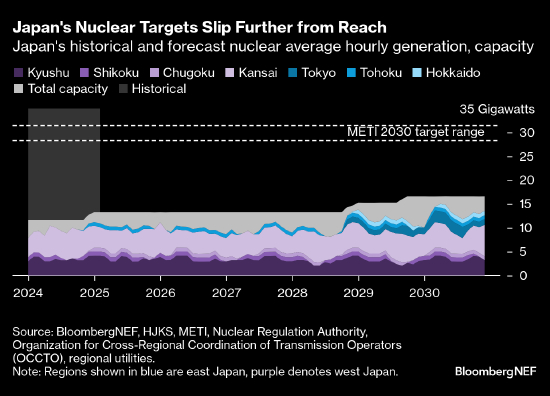 - 更远的未来存在更多不确定性,但彭博新能源财经估计,2030年至2040年间还有九座反应堆(总计9.8GW)可能重启。如果新的法规允许日本老化的核电机组延长寿命,使其运行时间超过60年,那么该行业仍将比2040年的目标区间少7GW。
