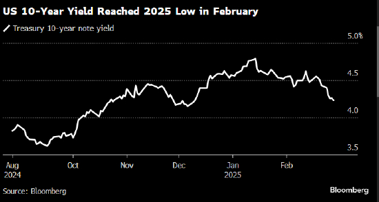 随着温和的通胀数据提振了对美联储降息的押注,美国国债市场录得7月以来的最大月涨幅,以短期收益率回到4%以下为2月份画上句号。