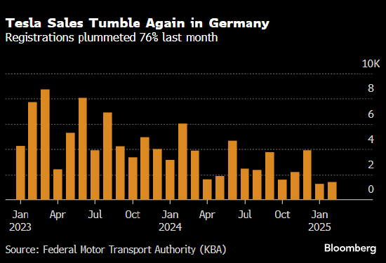 根据德国联邦机动车运输管理局的数据,特斯拉销量暴跌76%,至1429辆。此番表现与该国电动汽车整体销售表现形成了鲜明对比,后者2月增长了31%。