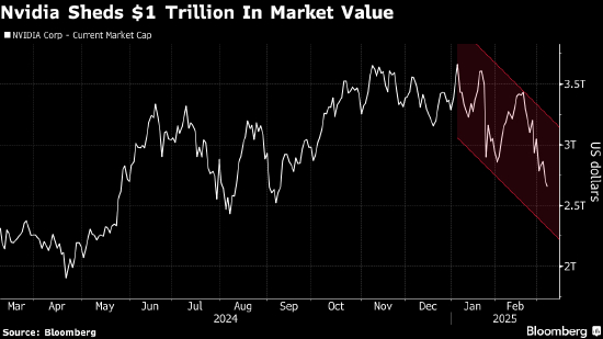 这家芯片制造商周五一度下跌1.9%,市值从1月6日触及的3.66万亿美元高点跌至2.65万亿美元。缩水幅度超过27%为2022年以来最大,当时正值OpenAI的ChatGPT首次亮相引发芯片和其他数据中心设备的支出热潮前夕。