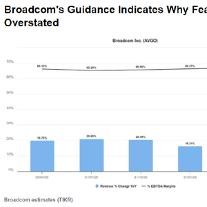 我认为对投资者来说,一个积极的消息是,博通的业绩指引显示,即使该公司已经超出了第一财季的内部业绩预期,其人工智能业务收入在第二财季仍有望保持强劲。我相信这让投资者对本财年剩余时间的前景更有信心。如上所述,分析师仍预计博通在2025年的营收增长率约为20%,同时其利润率保持相对稳定。因此,对威睿(VMware)的整合在博通已得到良好执行,使得投资者能够更多地关注其人工智能业务机会。