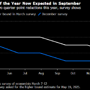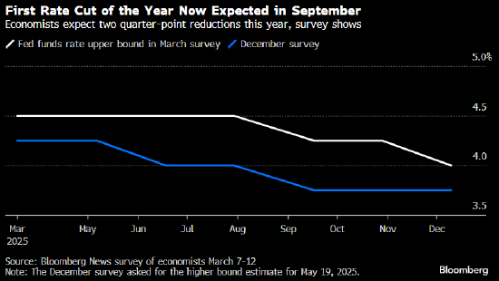 根据预测中值,经济学家认为降息分别在9月和12月。在去年12月的调查中,经济学家预测2025年将有三次降息,首次发生在3月。