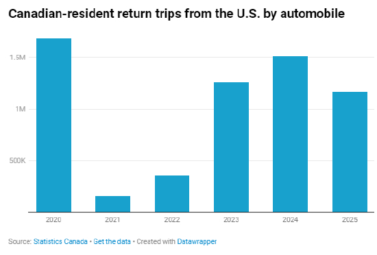 即使关税谈判仍在变化不定,前往美国的旅行已经受到了影响。政府统计数据显示,2 月份加拿大人从美国驾车返回本国的次数同比下降了约 23%。