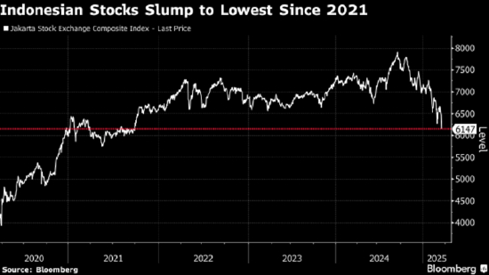 印尼股市周二创下十多年来的最大跌幅,并自疫情以来首次触发交易暂停,围绕经济和消费者支出疲软的担忧打击投资者情绪。