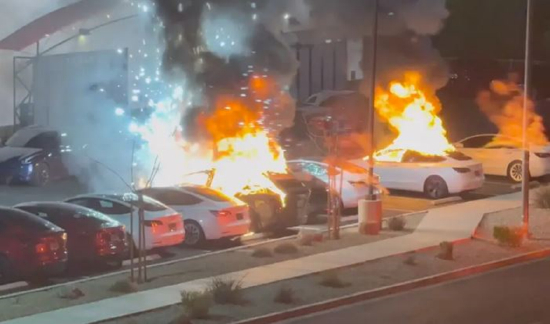 据拉斯维加斯大都会警察局称,当地时间周二午夜,在拉斯维加斯,一些特斯拉汽车在特斯拉碰撞中心的停车场里被点燃。安全摄像头在凌晨2点45分左右捕捉到一名身穿黑色衣服的人向车内投掷燃烧弹。