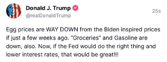 当地时间周四晚间,特朗普再次发帖呼吁美联储降息。特朗普说鸡蛋、食品杂货和汽油价格都下来了,“现在,如果美联储做正确的事情,降低利率,那就太好了!!”