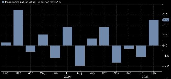 日本经济产业省周一公布的数据显示,2月份工业生产环比增长2.5%,为四个月来首次增长并高于市场预期的2.0%,创去年3月以来最快增速。