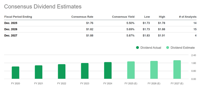 下图显示了 VICI Properties 的一致股息预测。2025 年的一致收益率为 5.50%,2026 年为 5.69%,2027 年为 5.87%,对于寻求兼顾股息收入和股息增长的投资者来说,它是一个绝佳的选择。