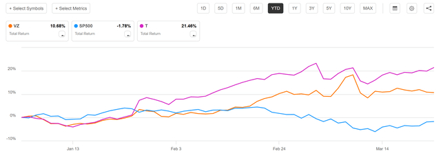 自 2025 年初以来,Verizon 的表现优于标准普尔 500 指数:标准普尔 500 指数的总回报率为 -1.78%,而 Verizon 的表现为 10.68%,这凸显了该公司的防御性及其降低投资组合波动性的能力(该公司 24 个月的贝塔系数为 0.34 也凸显了这一点)。然而,值得一提的是,AT&T(纽约证券交易所代码:T)在同一时间段内的表现更为强劲(21.46%)。