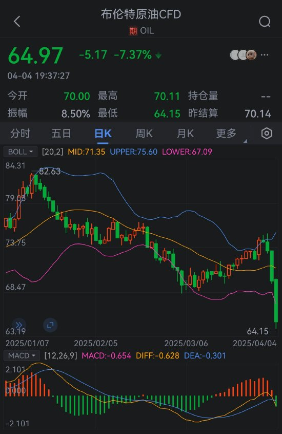 布伦特原油跌势加深,自2021年8月以来首次跌破每桶65美元,交易员消化了OPEC+的意外增产和迅速升级的全球贸易战影响。