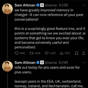 OpenAI首席执行官Sam Altman发文称:“我们大幅提升了 ChatGPT 的记忆能力 —— 它现在可以调用你之前所有的对话内容了!在我看来,这是个超棒的功能。它也指向了我们所期待的方向:人工智能系统能在你的人生中逐渐了解你,变得极为实用且个性化。”
