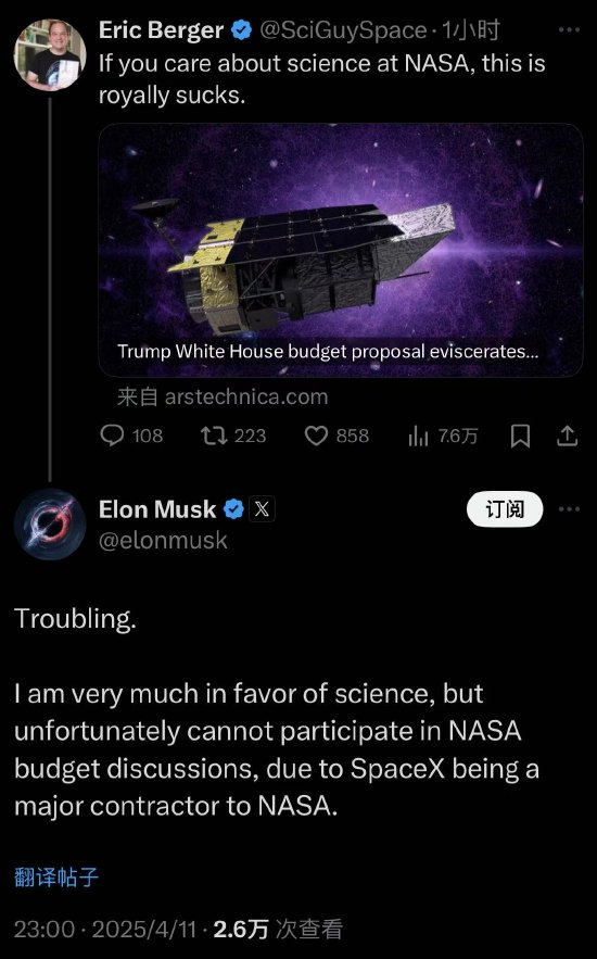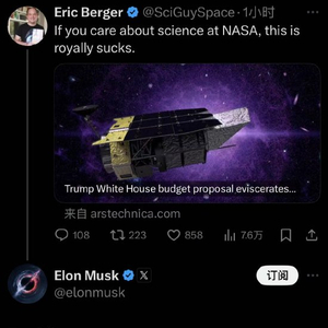 4月11日,Ars Technica的编辑Eric Berger分享了关于白宫计划大幅缩减美国国家航空航天局(NASA)科学研究预算的文章,并表示,“如果你关心NASA的科学研究,那么这真是太糟糕了。”