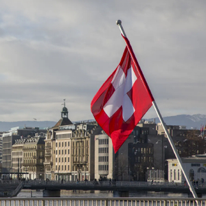 瑞士日内瓦湖旁的瑞士国旗。日内瓦有许多专门从事财富和资产管理的瑞士私人银行。