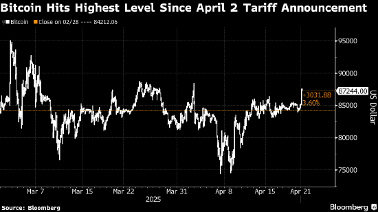 截至周一纽约早盘,比特币上涨约3.9%,突破88400美元,几乎收复自4月2日特朗普宣布对等关税以来的全部跌幅。