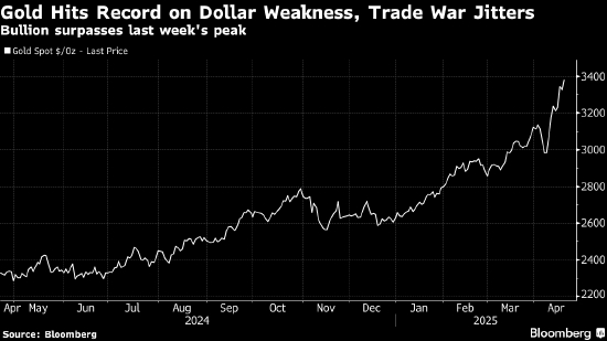 美元跌至2023年末以来的最低点的同时金价飙升至每盎司3435美元上方。特朗普正在研究能否免去鲍威尔的美联储主席职务,他还一再要求降息。芝加哥联储银行行长Austan Goolsbee则公开发声反对削弱央行独立性。