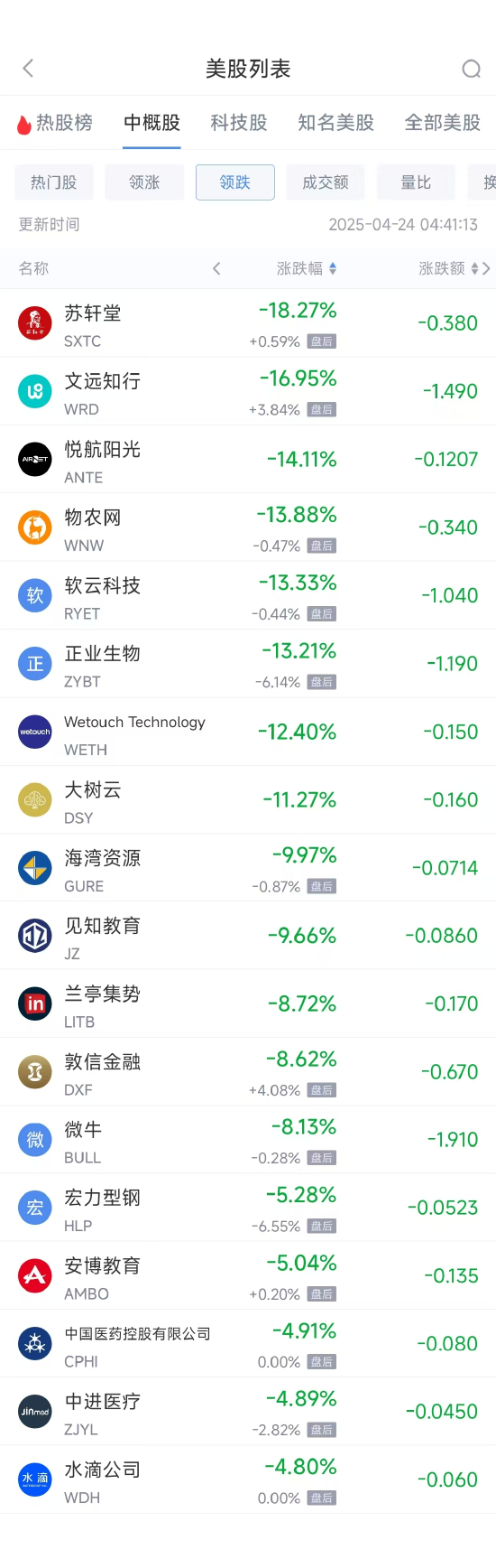 领跌中概股列表: