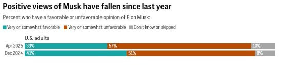 民调显示马斯克受欢迎程度急剧下降,仅33%美国人对其有好感