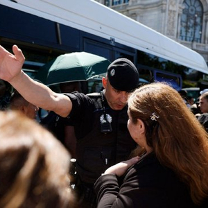 4月28日,马德里公交车站一名警察引导乘客。