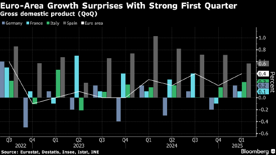 这一结果意味着欧元区已连续五个季度实现经济增长,其中最大的两个成员国德国和法国均恢复增长。然而展望未来,商业调查显示增长减弱 —— 主要原因是围绕美国意图的不确定性打击了信心,加之关税本身的实际影响。