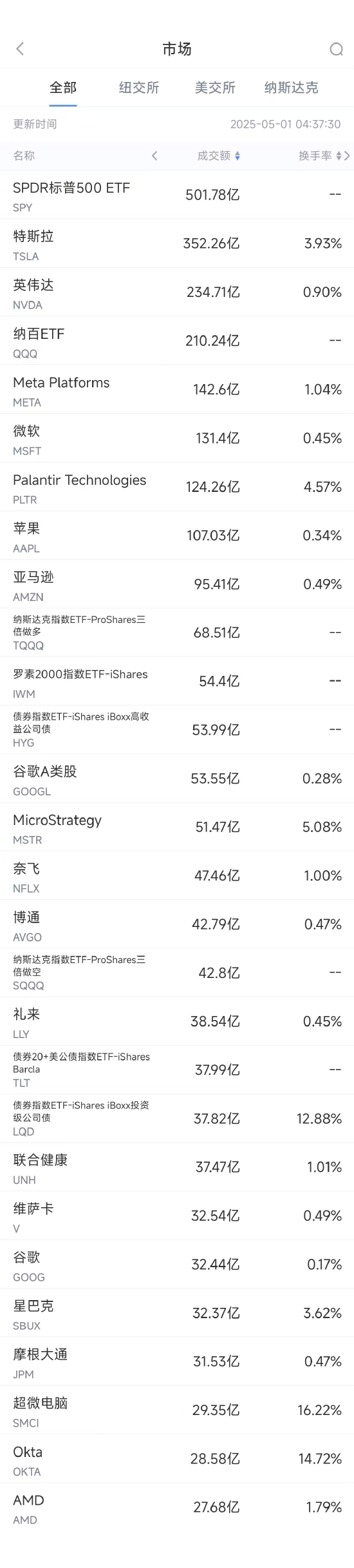 4月30日美股成交额前20:超微电脑初步财报远逊预期