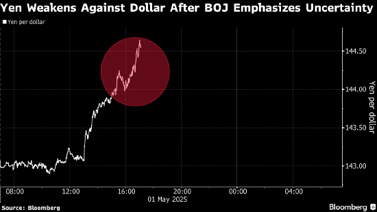随着日本央行行长植田和男在讲话中提及关税带来的不确定性,日元兑美元跌幅进一步扩大。此前日本央行维持利率不变并推迟了实现通胀目标的时间预期,致使日元走弱。