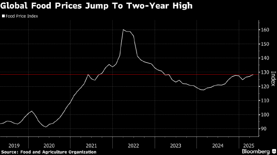 全球粮食价格4月升至两年高点,表明关税不确定性开始对贸易构成压力。