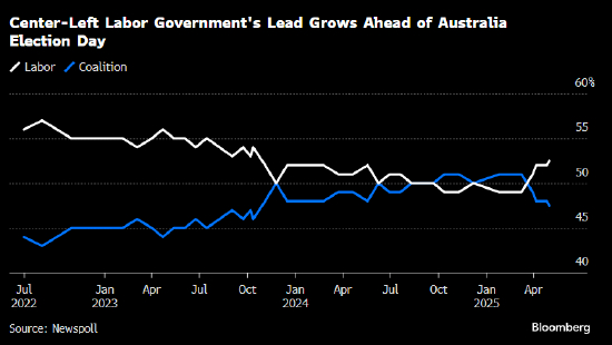 民调显示,澳大利亚总理阿尔巴尼斯有望成为2004年以来第一位连续赢得选举的澳大利亚领导人,他领导的中左翼政府在周六投票前扩大了对反对党的领先优势。