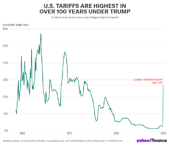 特朗普已经在推动美国回到过去。他实施了一系列新的进口税,将平均关税税率从他上任时的 2.5% 提高到了现在的 25% 左右。这是自 20 世纪初以来的最高水平。如果这些关税继续生效,每年将给美国企业和消费者带来超过 5000 亿美元的税收负担。