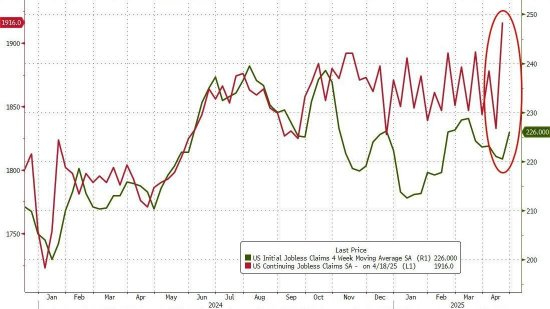 反映领取失业救济的总人数的持续申领失业金人数在截至4月19日当周升至192万人,是自2021年11月13日以来的最高水平,也高于经济学家预期。
