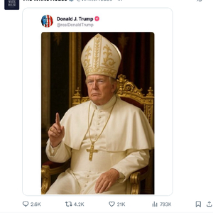 当地时间周五,美国总统特朗普在旗下社交媒体Truth Social上发布了一张自己身穿教皇服的恶搞图片。令人吃惊的是,白宫在X上的官方账号竟然转发了这张图片。