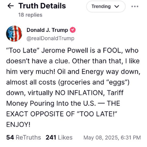 美国总统特朗普在社交媒体发文称,“‘太迟(先生)’鲍威尔是个傻瓜,他毫无头绪。除此之外,我非常喜欢他!石油和能源价格下降,包括食品杂货和‘鸡蛋’在内,几乎所有成本价格都有所降低,通货膨胀几乎不存在,同时关税资金不断流入美国 —— 这与‘(降息)太晚了’的说法完全相反!好好享受吧!”