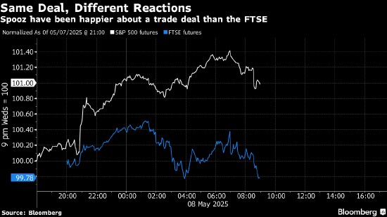 美英协议细节泄露后,市场反应颇有意思。美国股指期货稳稳走强,英国富时指数则几乎回吐涨幅,回到持平位置。看起来,“别让事实妨碍好故事”的原则在纽约比在伦敦更受欢迎。