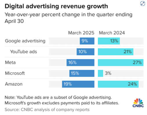 这张手风琴式图表显示了谷歌、Meta、亚马逊和微软在截至 2025 年 4 月 30 日(日历第一季度)的季度广告收入增长情况。