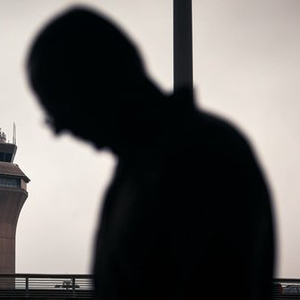 2025 年 5 月 6 日:一名男子站在 C 航站楼外,背景是机场控制塔,地点是新泽西州纽瓦克自由国际机场。由于空中交通管制人员短缺和设备故障,往返或途经纽瓦克自由国际机场(EWR)的乘客经历了数天的航班延误和取消。