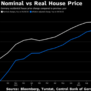 彭博社利用官方数据计算,经通胀因素调整后,德国现有住房销售的非季节性调整平均价格 4 月同比上涨 0.6%。