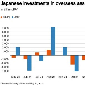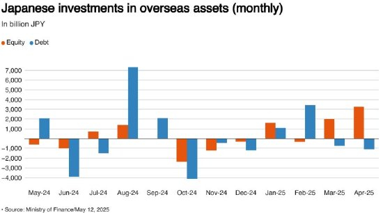 日本投资者4月大幅增加海外股票购买,在美国关税引发全球市场动荡之际重新平衡投资组合,从债券转向折价的国际股票。日本财务省周一公布的数据显示,日本投资者净买入3.27万亿日元(约合223.7亿美元)海外股票,创下至少2005年以来的单月最高纪录,同时从海外债券中撤资1.08万亿日元。