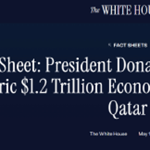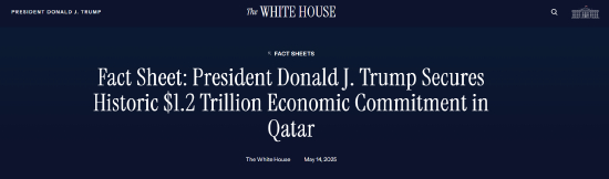 美国白宫当地时间2025年5月14日发布消息,称特朗普今天在卡塔尔与卡塔尔签署了一项协议,以产生价值至少1.2万亿美元的经济交流。特朗普还宣布了美国和卡塔尔之间总额超过2435亿美元的经济协议,包括向卡塔尔航空公司出售波音飞机和通用电气航空发动机。