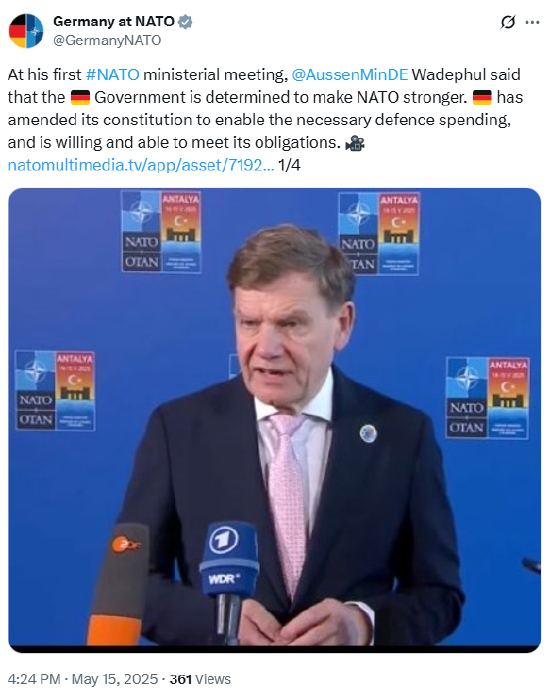“德国有能力也有意愿履行这些义务,“Wadephul周四在土耳其安塔利亚举行的北约外长会议间隙表示。特朗普要求达到5%,“而我们正在跟进。”