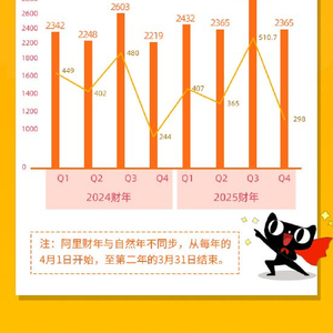 阿里发布2025财年第四财季财报:营收2365亿元(淘天1013.69亿+国际数字商业335.79亿+阿里云301.27亿+菜鸟215.73亿+本地生活161.34亿+大文娱55.54亿),同比增长7%。经调净利润298.47亿,同比增长22%。财报显示,根据股份回购计划,阿里2025财年以119亿美元回购了11.97亿股普通股,成为回购力度最大的中概股之一。同时,阿里宣布派发2025财年年度股息和特别股息总计46亿美元(注:阿里巴巴财年与自然年不同步,2024年4月1日至2025年3月31日为2025财年)。