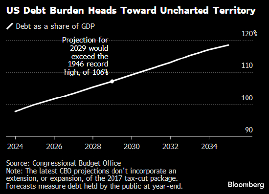 根据无党派机构国会预算办公室的估算,照当前趋势,联邦债务占GDP比重将在四年内创下历史新高。
