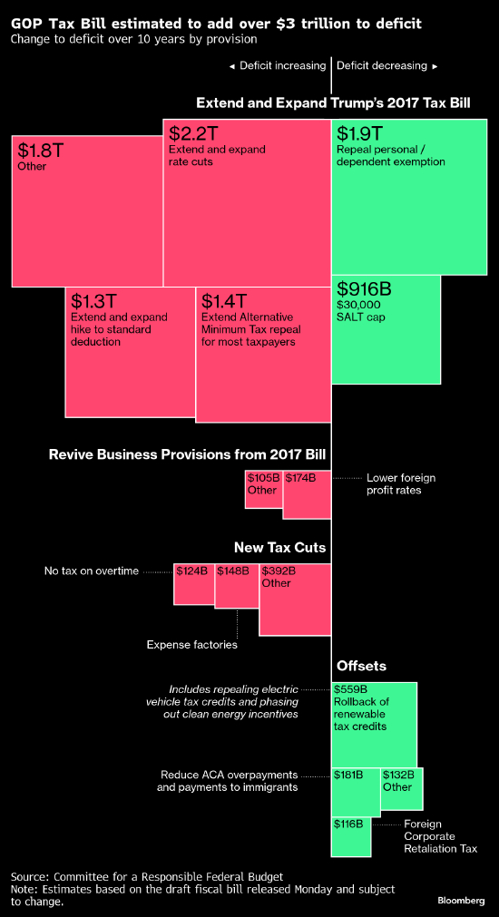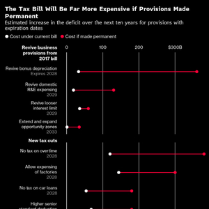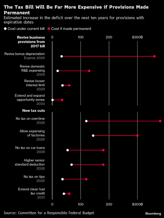 中间派财政监督组织“联邦预算问责委员会”(CRFB)的分析显示,如果将新减税激励延长至十年,带来的赤字总增幅将达5.2万亿美元,高于国会税收联合委员会预估的3.8万亿美元。若考虑对低收入群体的医疗补助(Medicaid )及其他项目的削减,CRFB估算赤字净增幅为3.3万亿美元