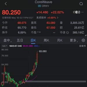 美国东部时间 5 月 16 日,人工智能基础设施供应商 CoreWeave 股价本周迎来爆发式增长,过去五个交易日累计涨幅近 60%,市值攀升至约 380 亿美元,较 3 月底 IPO 时翻倍。这一涨势主要得益于其超预期的营收增长及英伟达的战略持股披露。