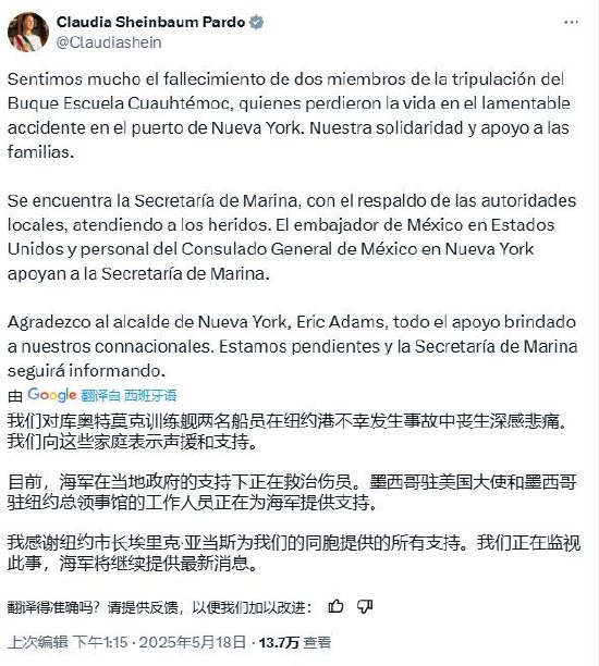 她发文称:“目前,海军在当地政府的支持下正在救治伤员。墨西哥驻美国大使和墨西哥驻纽约总领事馆的工作人员正在为海军提供支持。”
